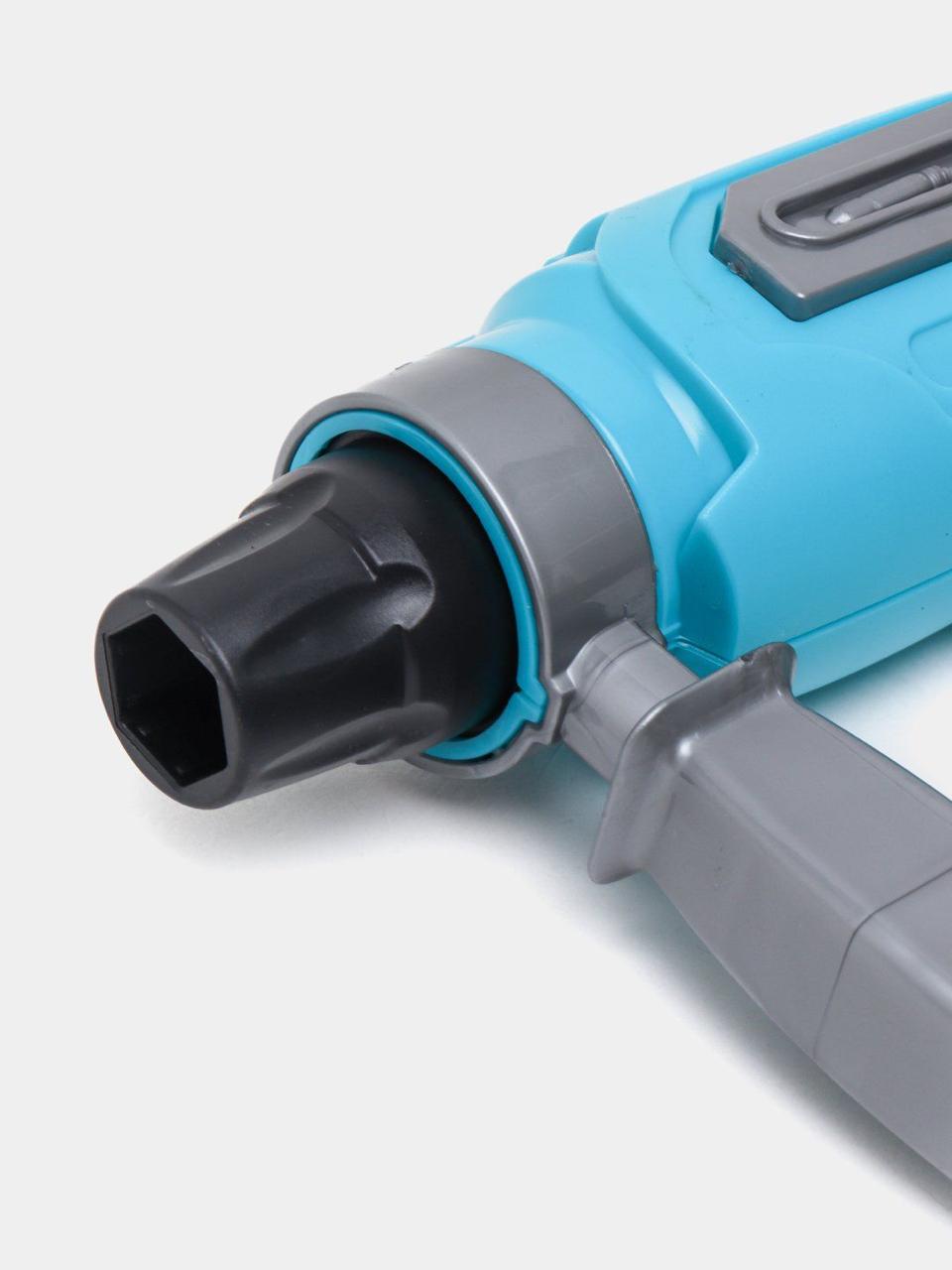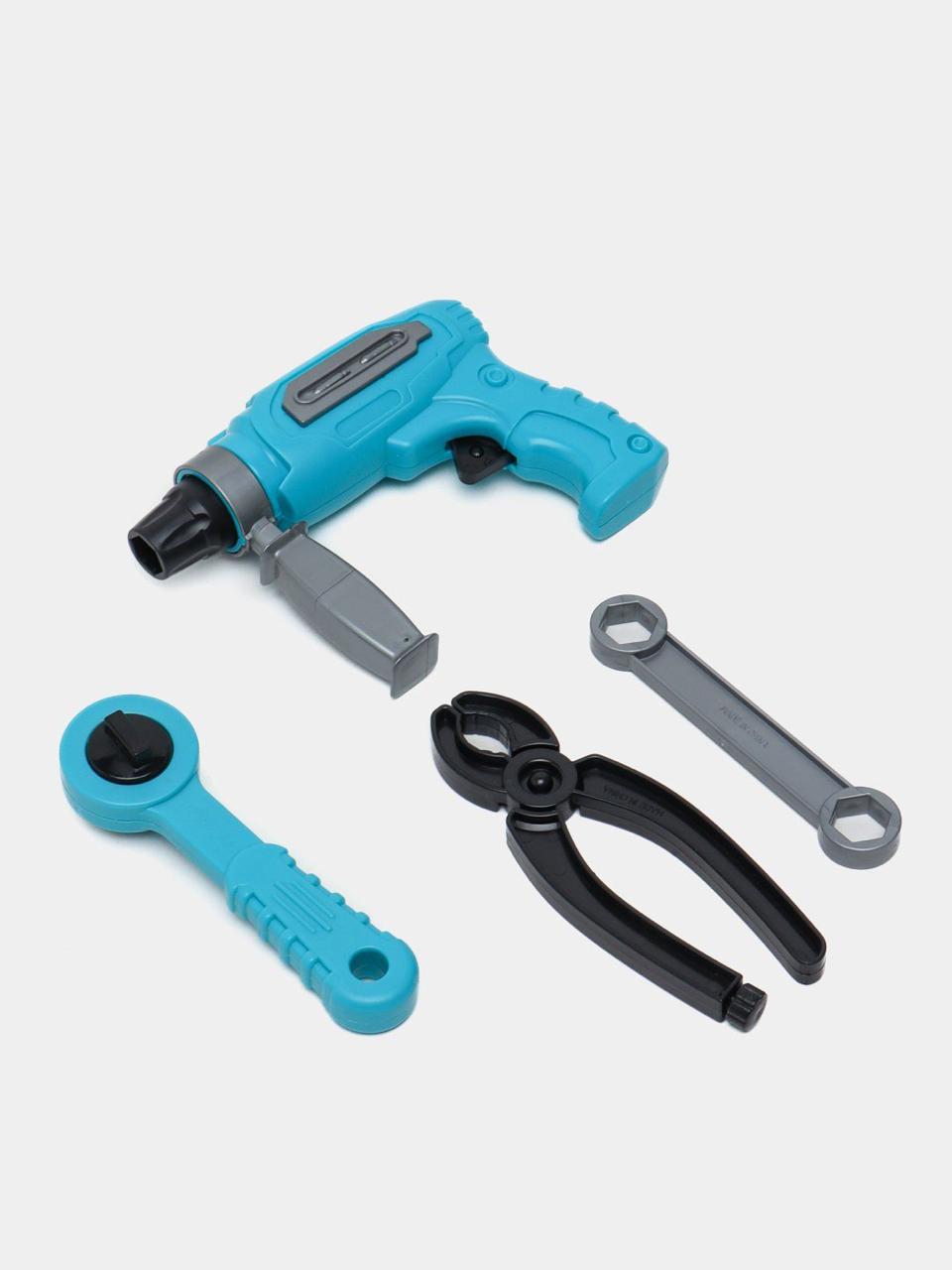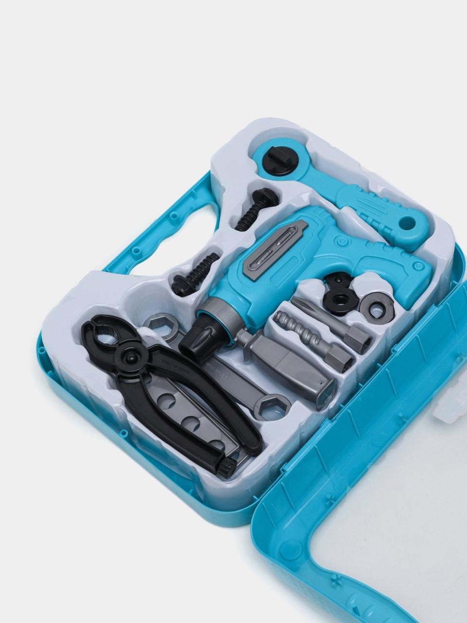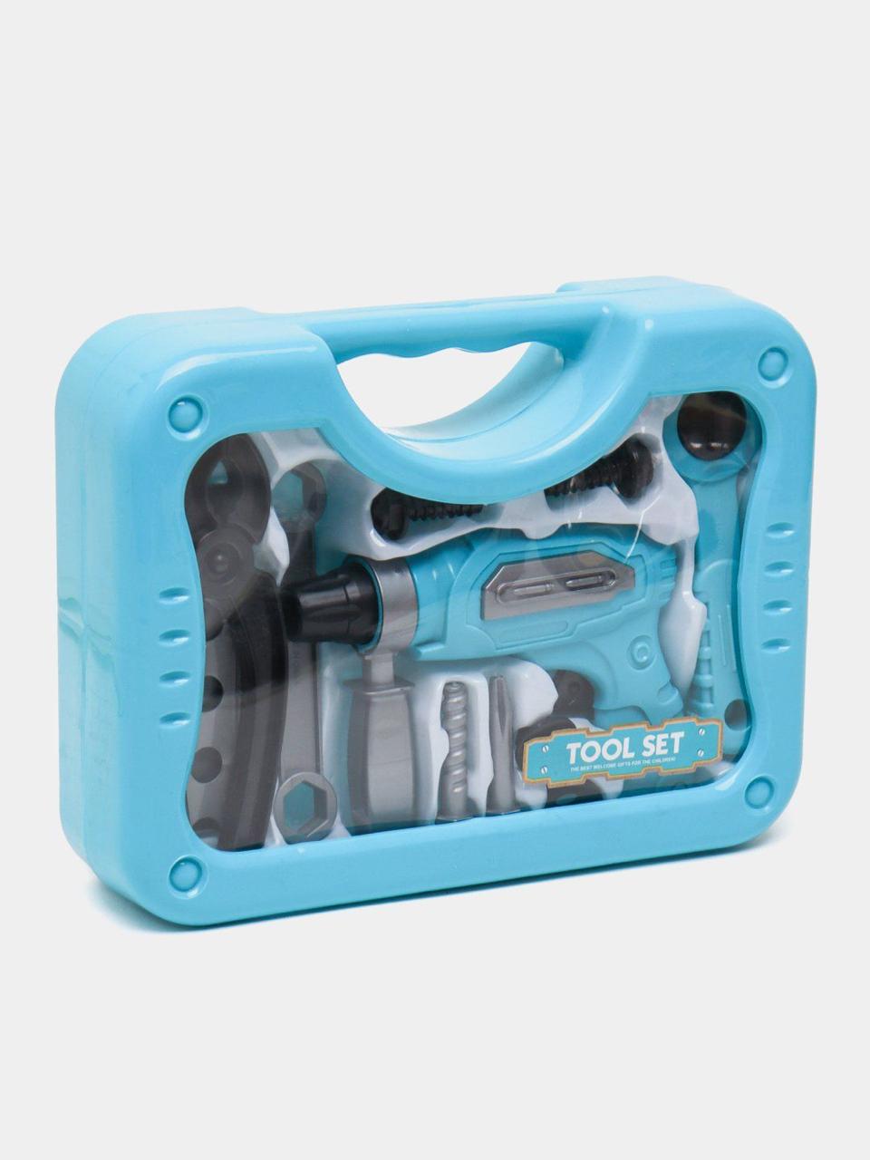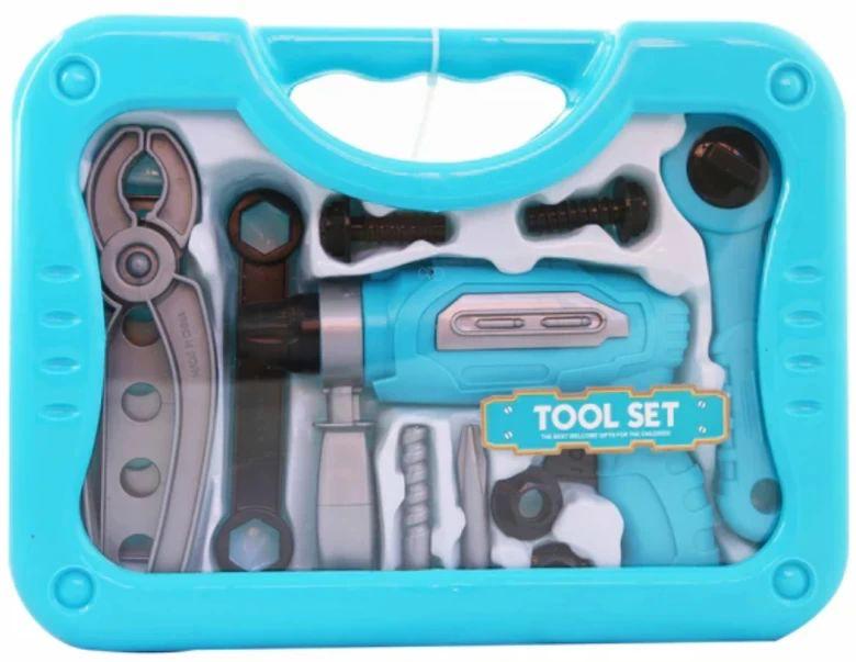 The set includes a variety of toy tools such as a drill, wrench, and screwdrivers, all neatly packed in a blue plastic carrying case. It’s designed for children to engage in imaginative play, mimicking real-life construction or repair activities. Tool sets like these help children develop creativity and role-playing skills