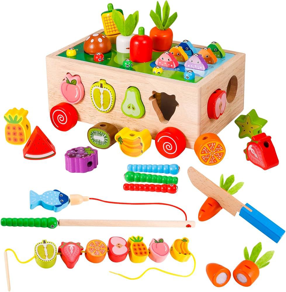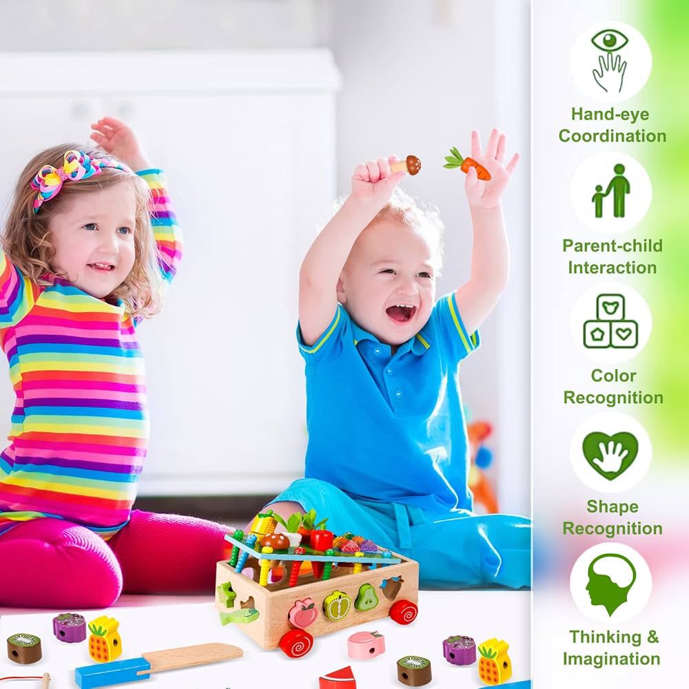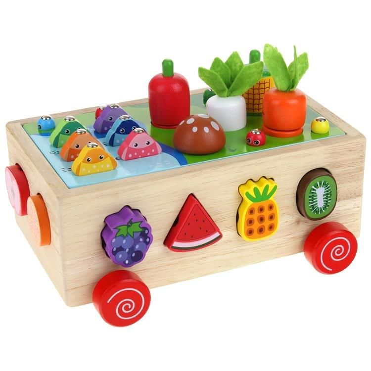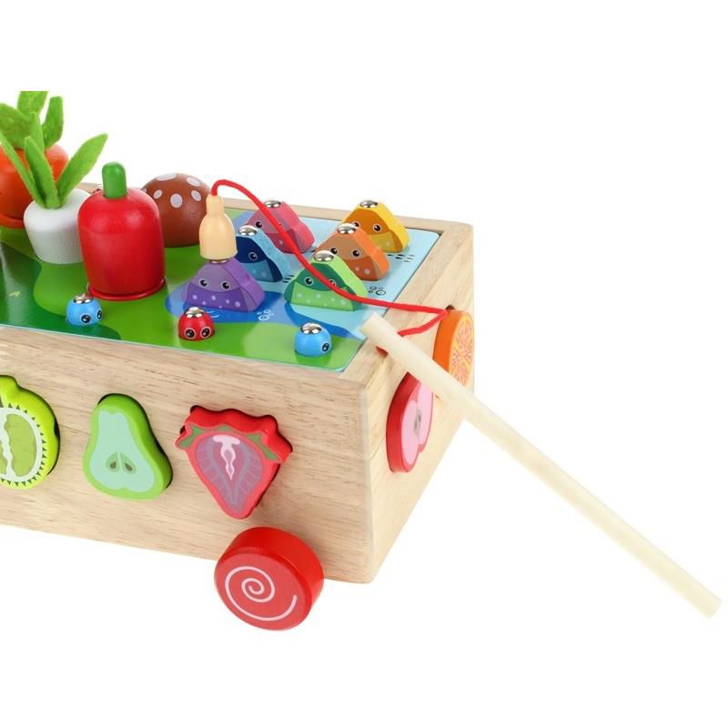Fantastic fun and learning in one. A solid wooden car with holes at the top and on the side in various shapes. The main task of the sorter is to match the blocks to the appropriate holes, thanks to the colorful blocks it also provides great fun. The set includes wooden vegetables with Velcro and a knife for cutting them. You can also fish and catch worms with a fishing rod with a magnet. There are holes in the fruit through which you can thread a wooden needle with a string. The car also serves as a trolley for the elements of the set, after finishing the game, we open the top part of the car and hide all the elements inside. This multifunctional toy will give many children a lot of fun during play. Additionally, you can be sure that the fun will have no end and will give a lot of pleasure to the child.